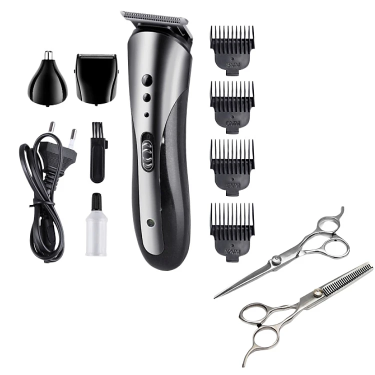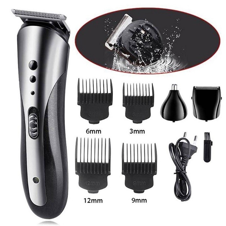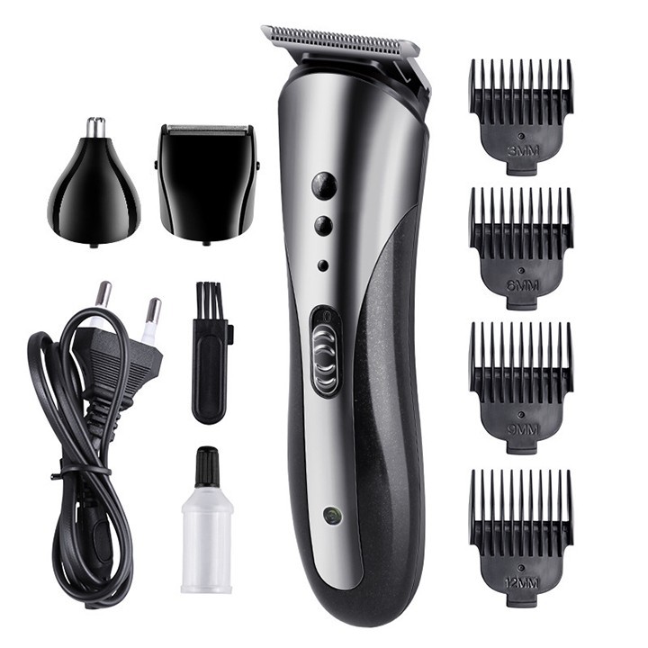 - Bộ sản phẩm bao gồm: 01 máy, 03 đầu thay thế (cắt tóc, cạo râu, tỉa lông mũi), 01 cáp sạc, 01 dầu bôi trơn, 04 cữ lược, 01 chổi vệ sinh.