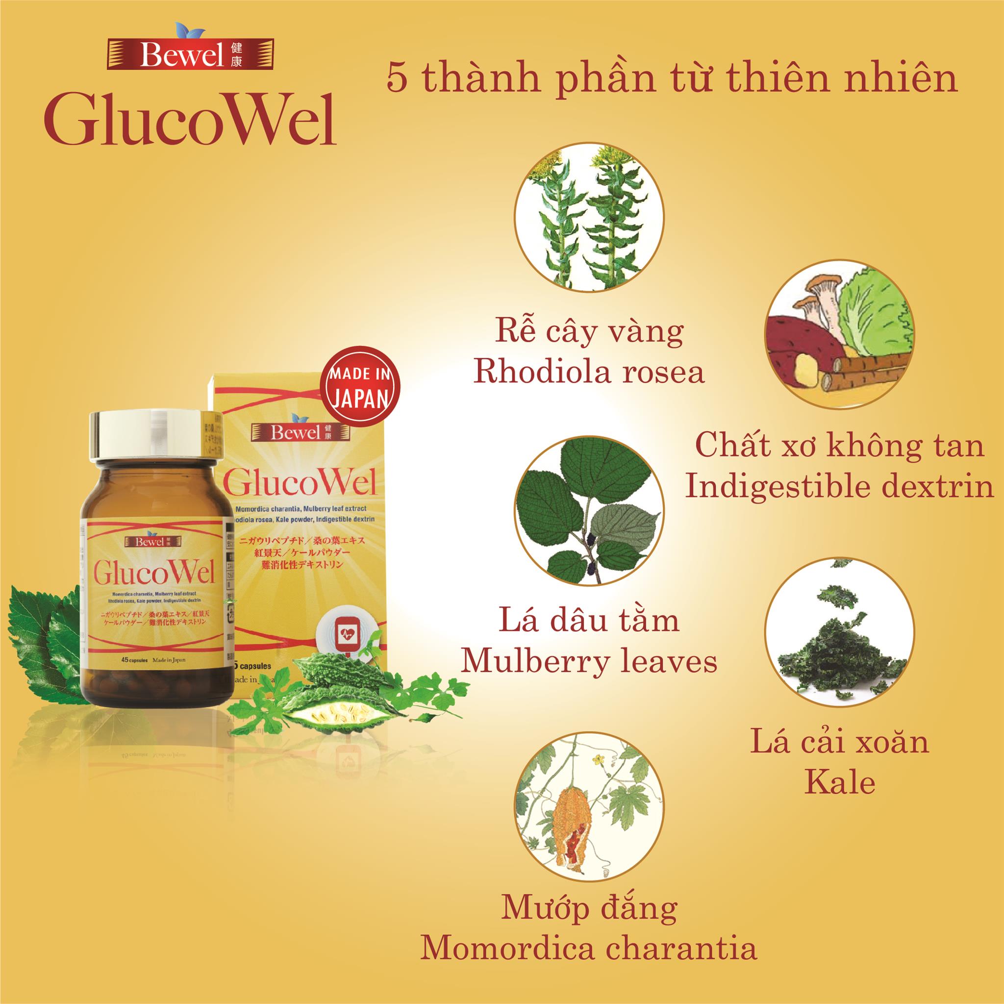 Bewel Glucowel được nghiên cứu và phát triển bởi công ty Dược phẩm Waki Pharma – Nhật Bản, có truyền thống lâu đời từ năm 1882. Sản phẩm là sự kết hợp đặc biệt từ các loại thảo dược phổ biến trong hỗ trợ điều trị tiểu đường bao gồm: tinh chất quả mướp đắng, tinh chất lá dâu tằm, rễ cây vàng, lá cải xoăn và chất xơ không tan giúp giảm và điều hòa lượng đường trong máu; Giúp hỗ trợ giảm bệnh lý tiểu đường.