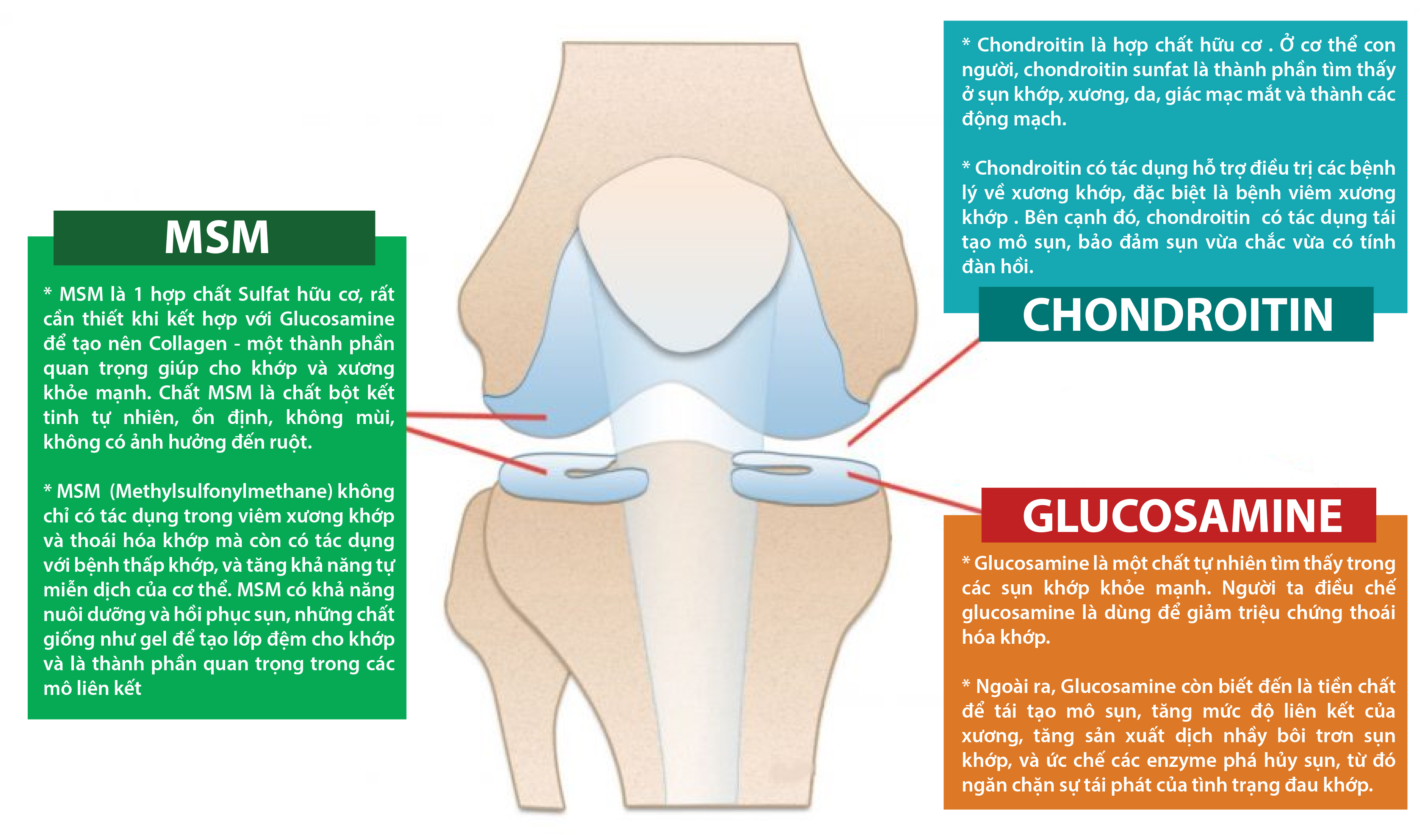 - Bổ sung dưỡng chất như: Glucosamin,Chondroitin, MSM, Calcium ( canxi) giúp bồi bổ sụn khớp, tăng tái tạo sụn.