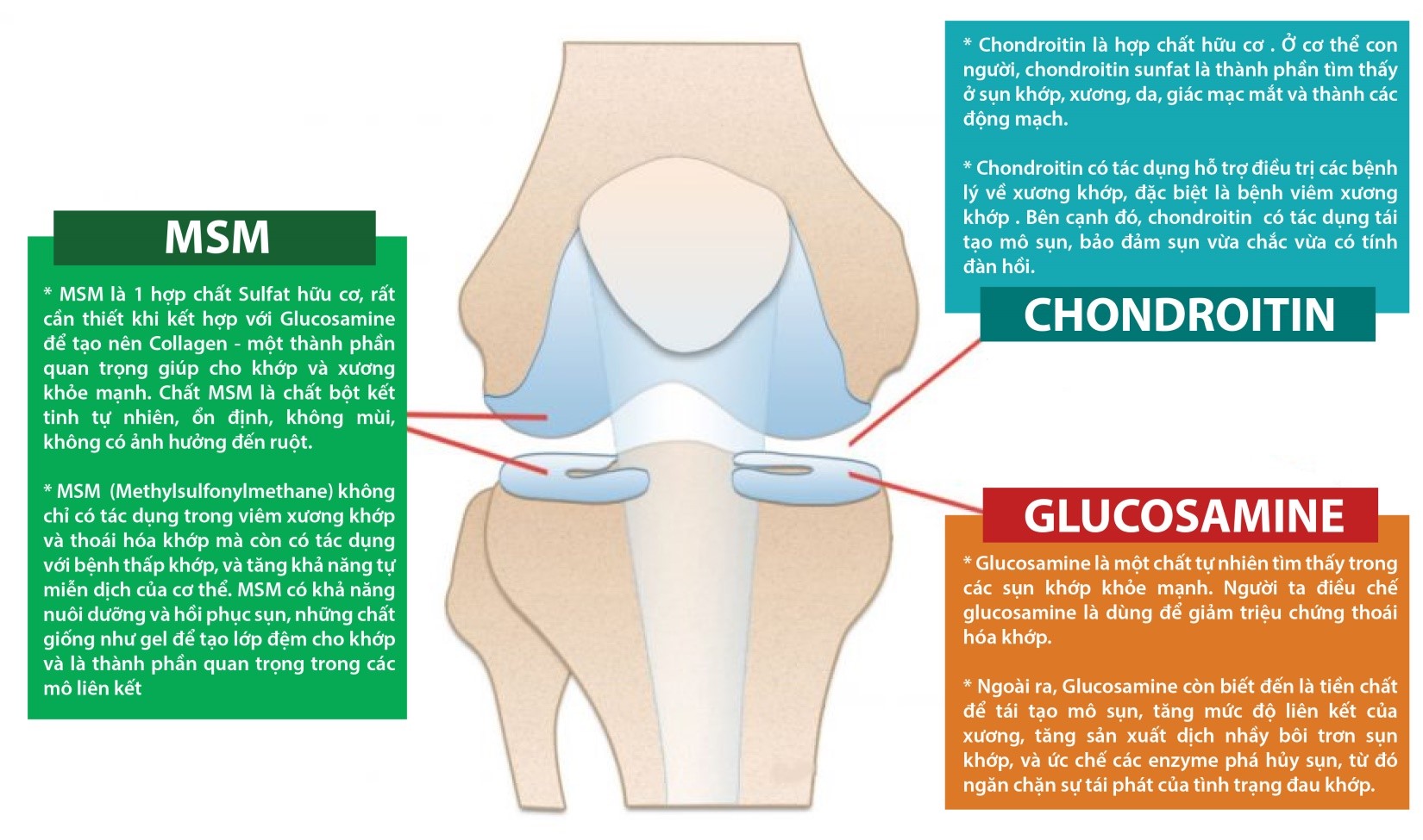 • Kích thích tái tạo mô sụn, tái tạo sụn khớp, từ đó duy trì sụn khớp khỏe mạnh, tránh bị hao mòn, tổn thương bởi gốc tự do.