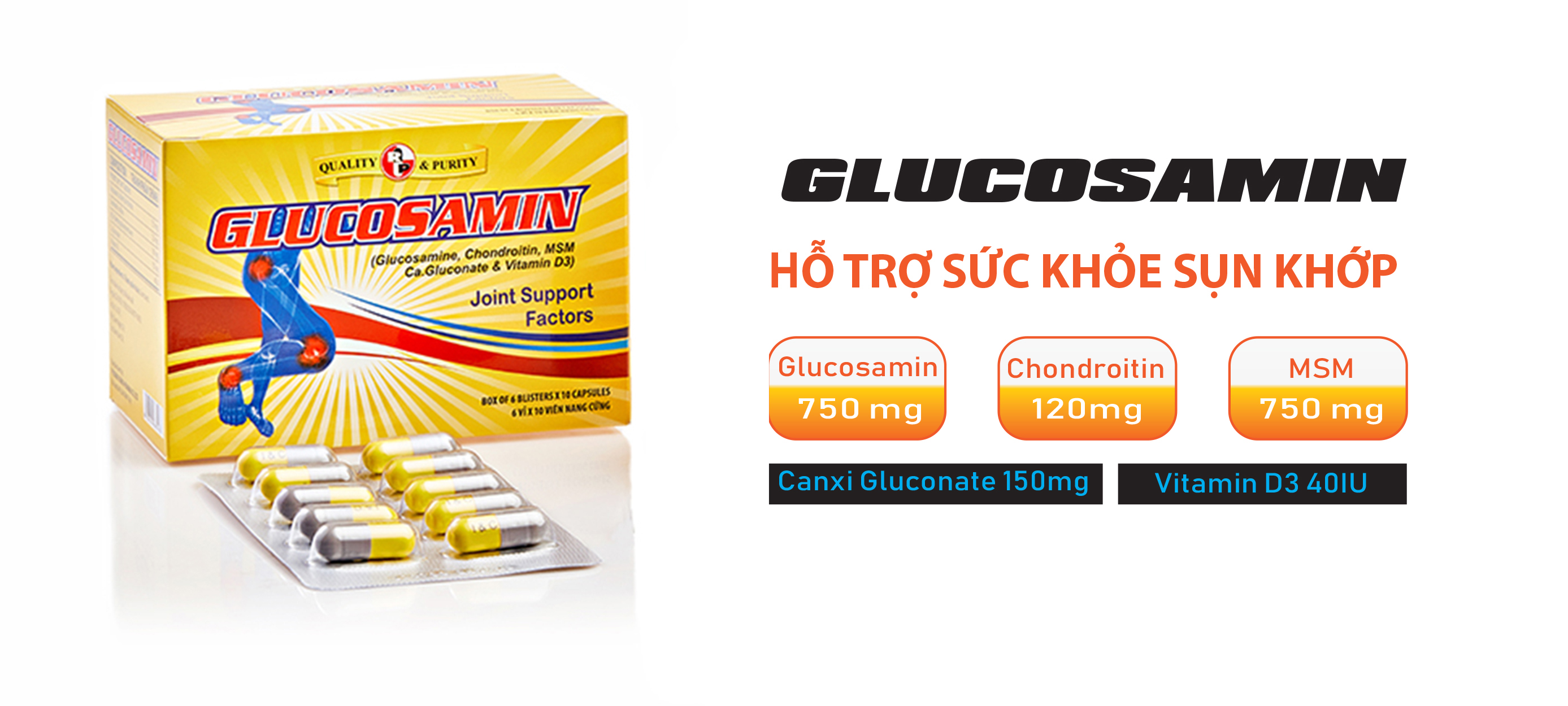 Thành phần chính của viên nang Glucosamin – Robinson Pharma Usa · Glucosamin sulfate kali chloride........................................... 750 mg · Chondroitin sulfate Na.......................................................... 120 mg · MSM (methylsulfonyl methane)........................................... 100 mg · Canxi gluconate.................................................................... 150 mg · Vitamin D3.............................................................................. 40 IU