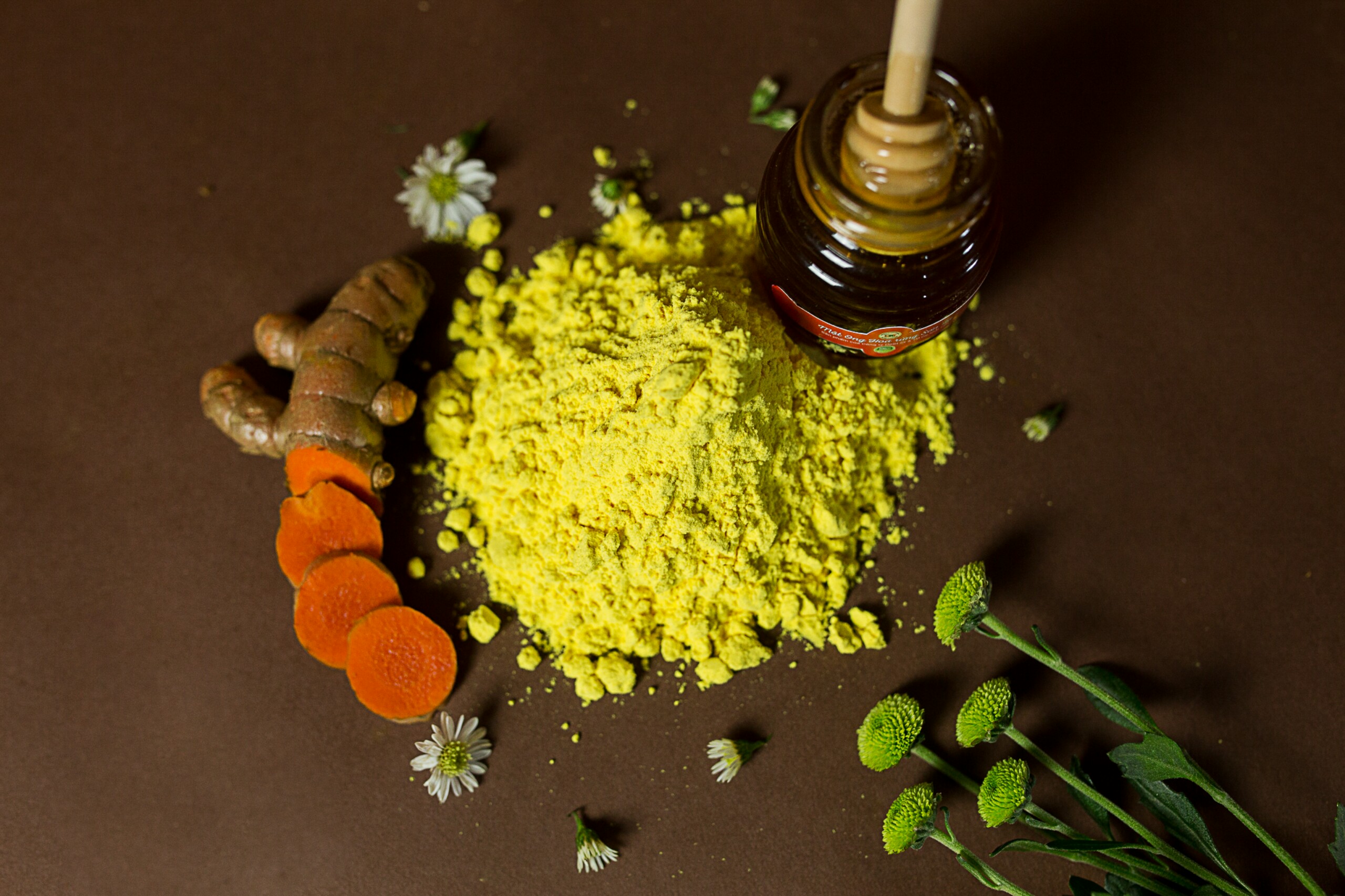 - Thành phần chính: Tinh bột nghệ đỏ