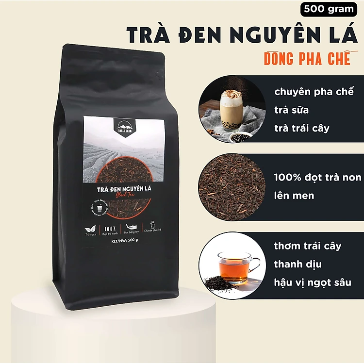 • Trà Đen Nguyên Lá được lên men 100% từ những đọt trà non được thu hoạch thủ công. Trà thơm thanh tinh tế, đậm vị trái cây, chát nhẹ, hậu vị ngọt sâu, chuyên dùng nhiều trong pha chế trà sữa, trà trái cây. Trà đen cũng là thức uống ưa chuộng tại các nước phương Tây do khi để lâu trong không khí và trà không mất màu như trà xanh, dùng kèm với bánh ngọt tráng miệng tại các nhà hàng trong tiệc trà.