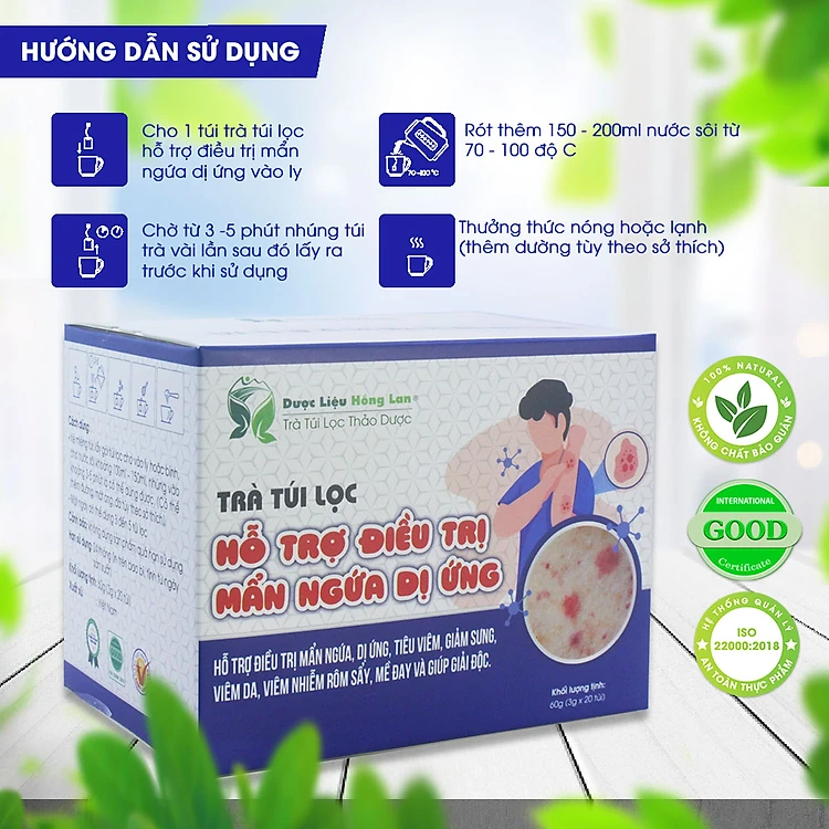 Trà hỗ trợ điều trị mẩn ngứa, dị ứng, viêm da, viêm nhiễm rôm sẩy, mề đay và giúp giải độc túi lọc hộp 60g (20gói x3g) Dược Liệu Hồng Lan