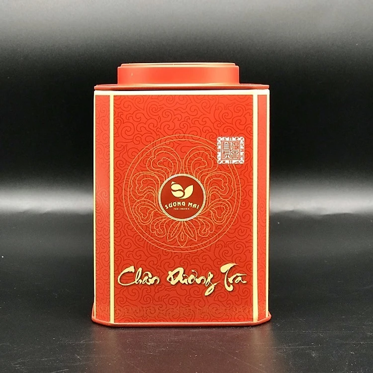 Hộp đựng Trà: Hộp thiếc với chế tác tinh xảo được đặt hàng riêng cho Trà Việt Sương Mai, với các đường nét hóa rồng và hoa văn thể hiện văn hóa Việt Nam