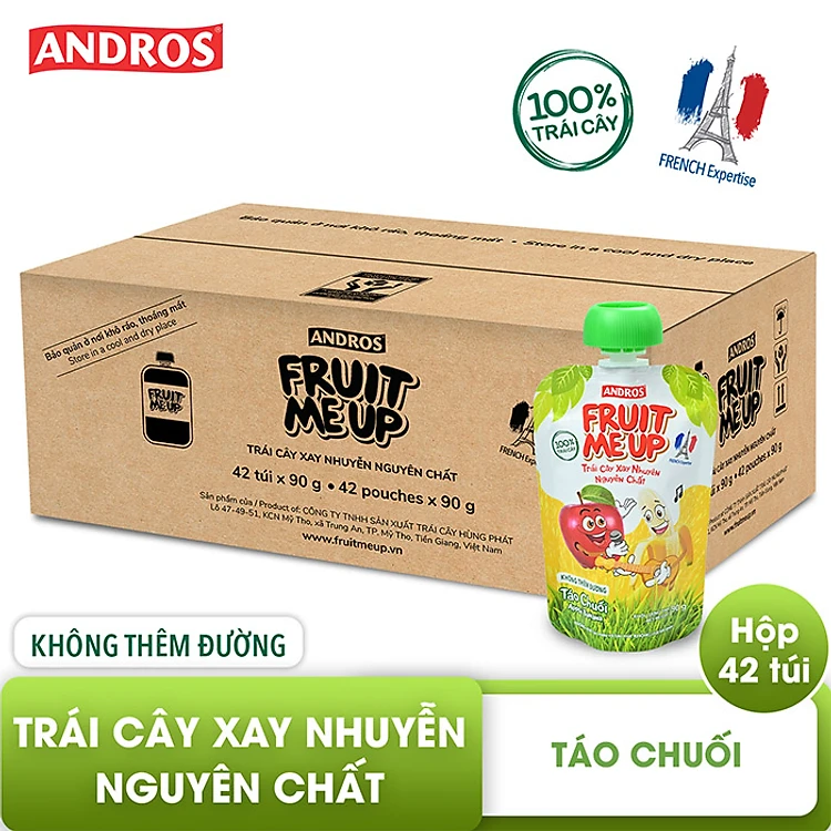 - Trái Cây Xay Nhuyễn Nguyên Chất Andros Fruit Me Up - Táo chuối - Thùng 42 túi - 90g x 42 mang đến một trải nghiệm mới và cách ăn trái cây ngon miệng hơn cho trẻ em.