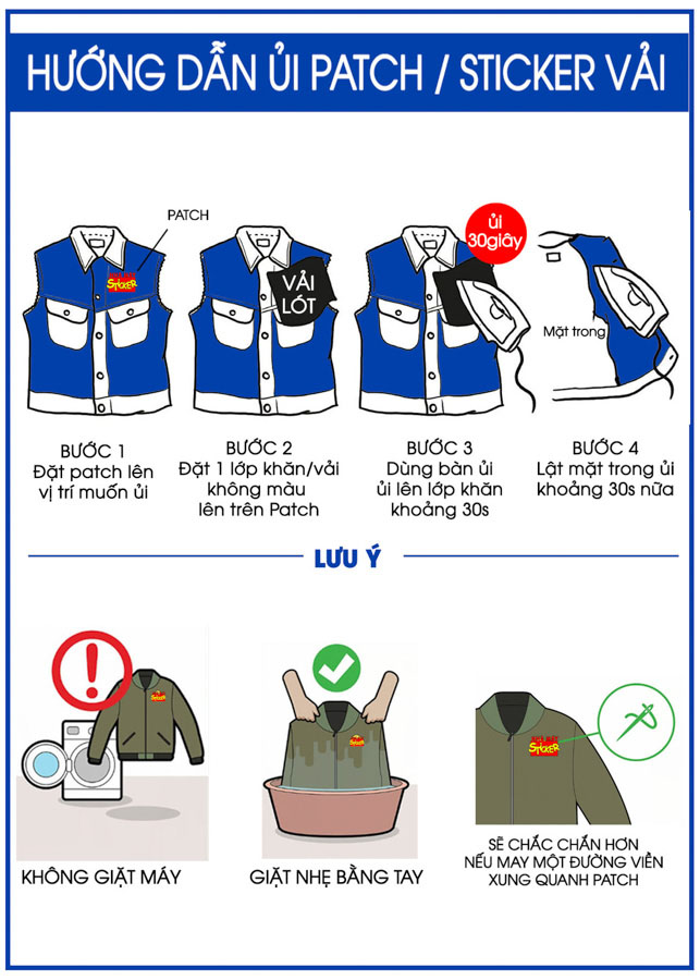 * Patch ủi hay còn gọi là sticker vải, huy hiệu vải. Mặt trước được thêu kỹ thuật cao, màu sắc và mẫu mã đa dạng, mặt sau có lớp keo đặc biệt khi ủi nhiệt độ cao sẽ bám dính lên các chất liệu bằng vải.