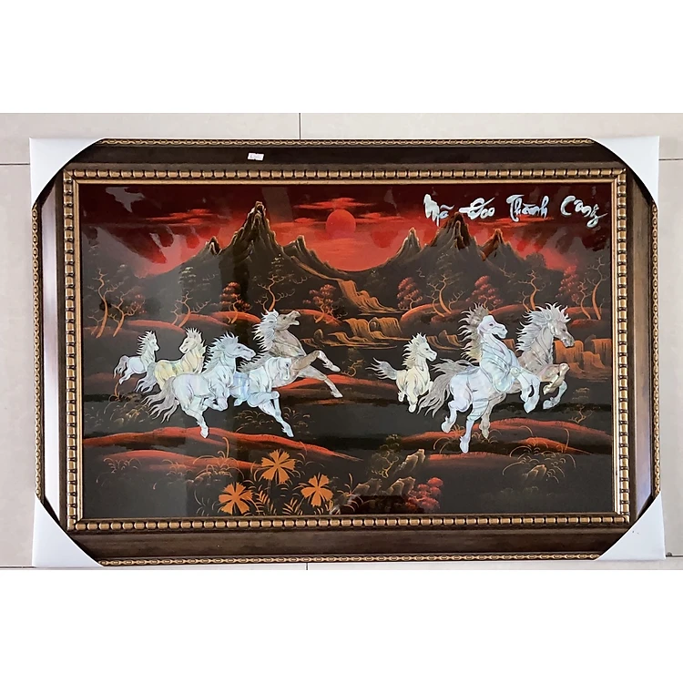TRANG SƠN MÀI KHẢM XÀ CỪ MÃ ĐÁO THÀNH CÔNG kích thước 50x80 cm ( tặng kèm khung)