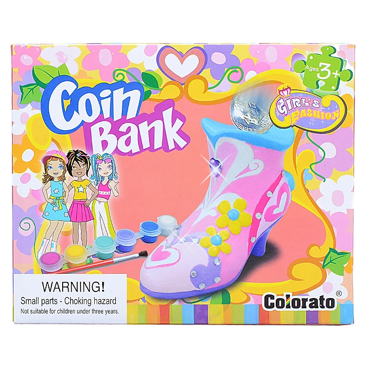 Với ống tiết kiệm hình đôi giày cùng các màu vẽ đi kèm giúp bé có thể tự trang trí ống tiết kiệm theo ý thích của mình. Bé có thể trang trí như một chiếc giày xinh đẹp của cô bé lọ lem. Sau khi thành phẩm, bé đã có một ống tiết kiệm độc đáo.
