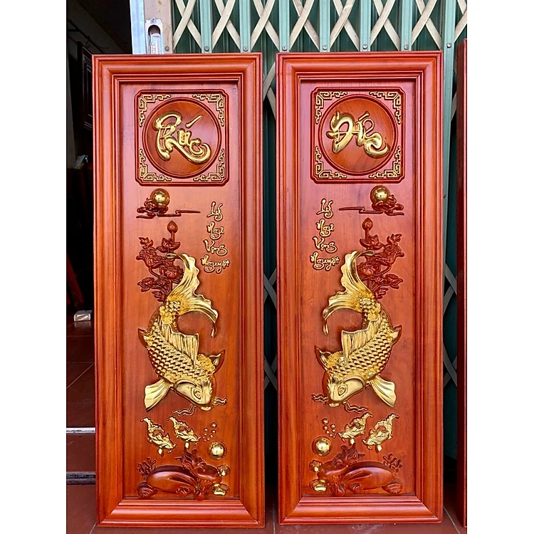 Tranh câu đối treo tường lý ngư vọng nguyệt bằng gỗ hương kt 37×107×4cm
