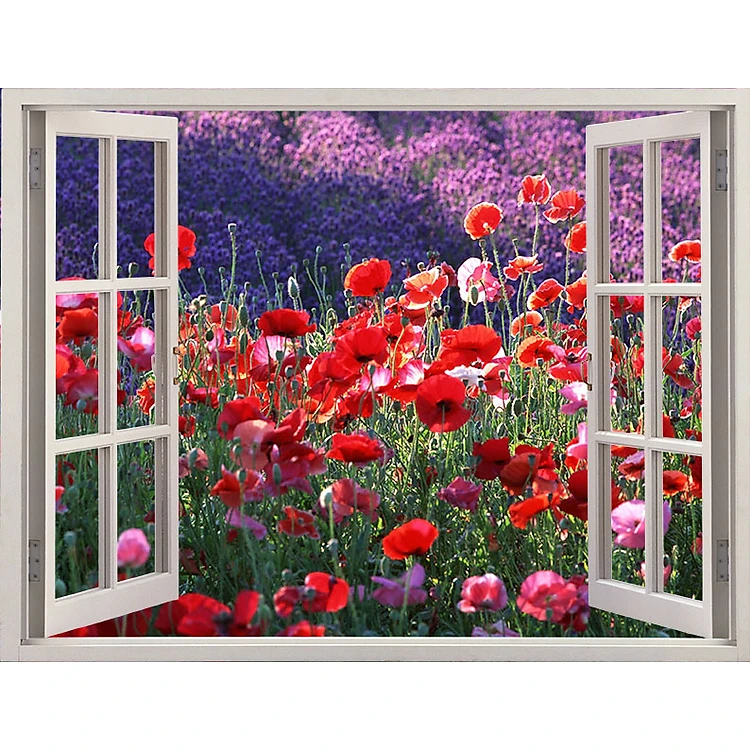 TRANH CỬA SỔ PVP-CS13 Tranh dán tường 3d thiên nhiên , cửa sổ mở RA VƯỜN HOA ĐỎ RỰC RỠ, GẦN GŨI THIÊN NHIÊN Tranh dán tường có sẵn keo tiện lợi.
