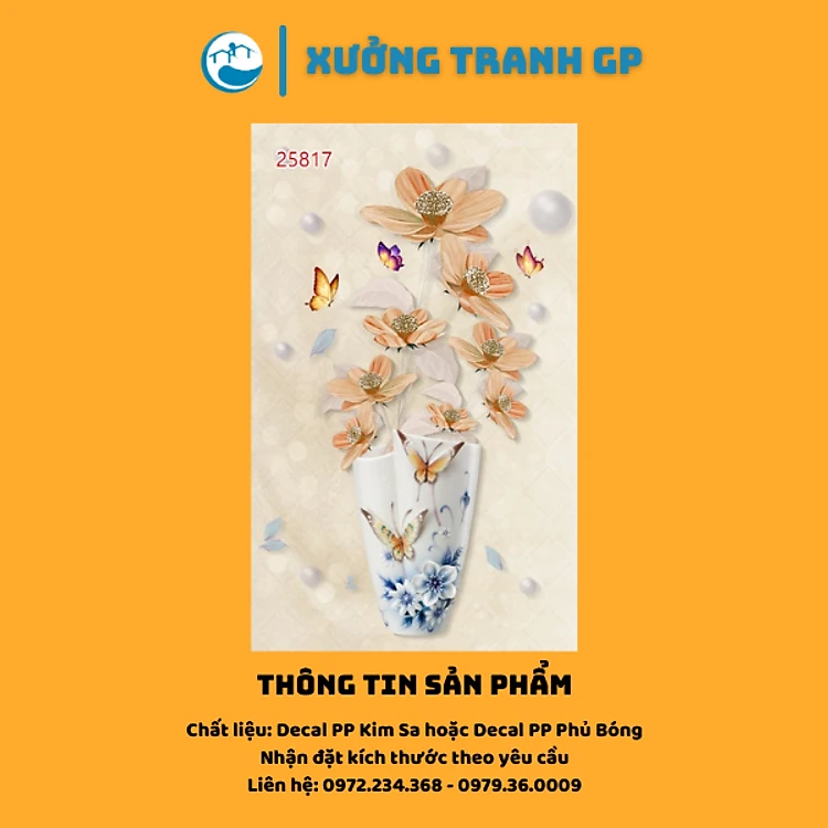 Tranh Dán Tường 3D Gia Phạm Phòng Khách, Phòng Ngủ Bình Hoa Phủ Bóng Có Sẵn Keo - Nhận Đặt Kích Thước Theo Yêu Cầu