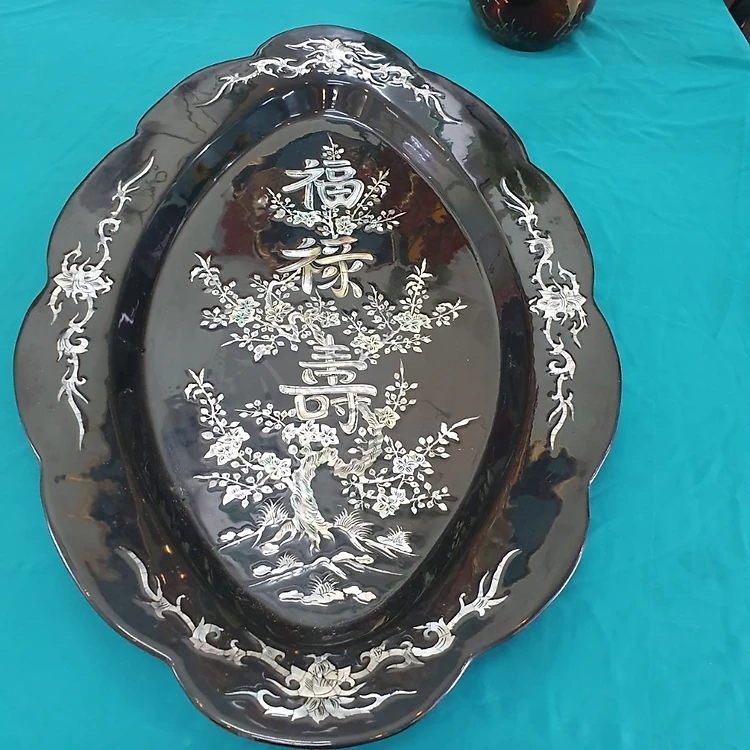 Tranh Dĩa sơn mài cẩn ốc Hoa Mai và chữ Phúc Lộc Thọ