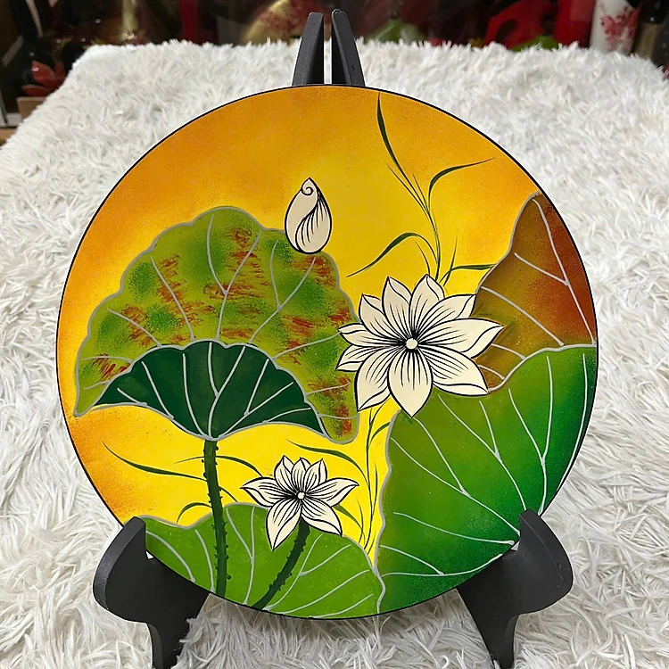 Tranh Dĩa sơn mài hoa sen cao cấp kèm chân dĩa trang trí nhà cửa, văn phòng, quà tặng ý nghĩa