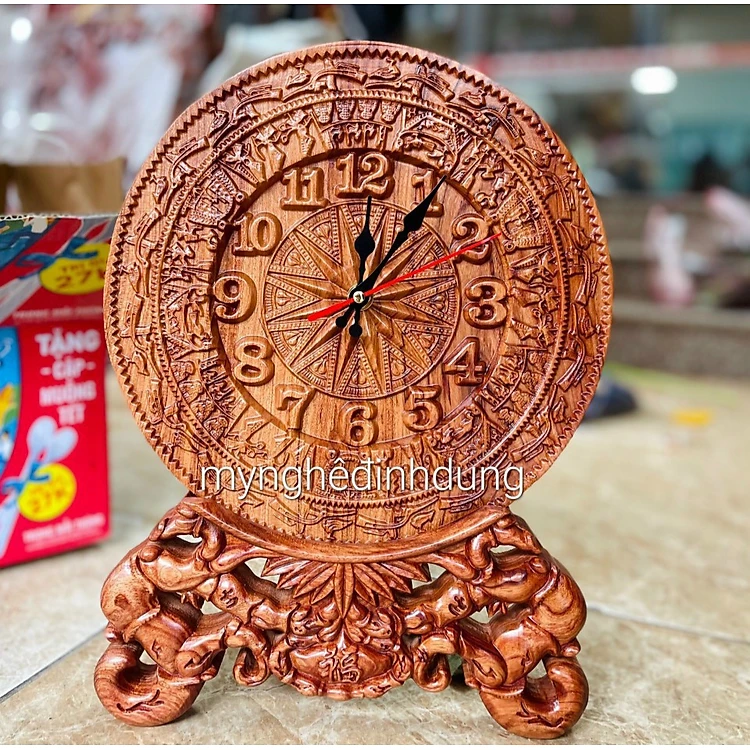 Tranh đồng hồ khắc trống đồng đông sơn trang trí phòng khách bằng gỗ hương đá kt mặt tròn 27×3×37cm