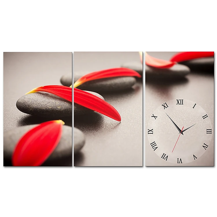 Tranh bao gồm 2 phần tranh nghệ thuật kết hợp với đồng hồ độc đáo ngay trên cùng 1 sản phẩm. Hình ảnh cánh hoa mềm mại với sắc đổ tươi thắm, hoà quyện cùng với những viên sỏi tròn trịa, thể hiện sự mộc mạc không cầu kì. Tranh in trên nền chất liệu PP cao cấp, cho ảnh chất lượng cao, không bị nhòe ảnh, bể ảnh, màng bảo vệ bóng mờ gia tăng khả năng chịu nước, chống bay màu tốt.