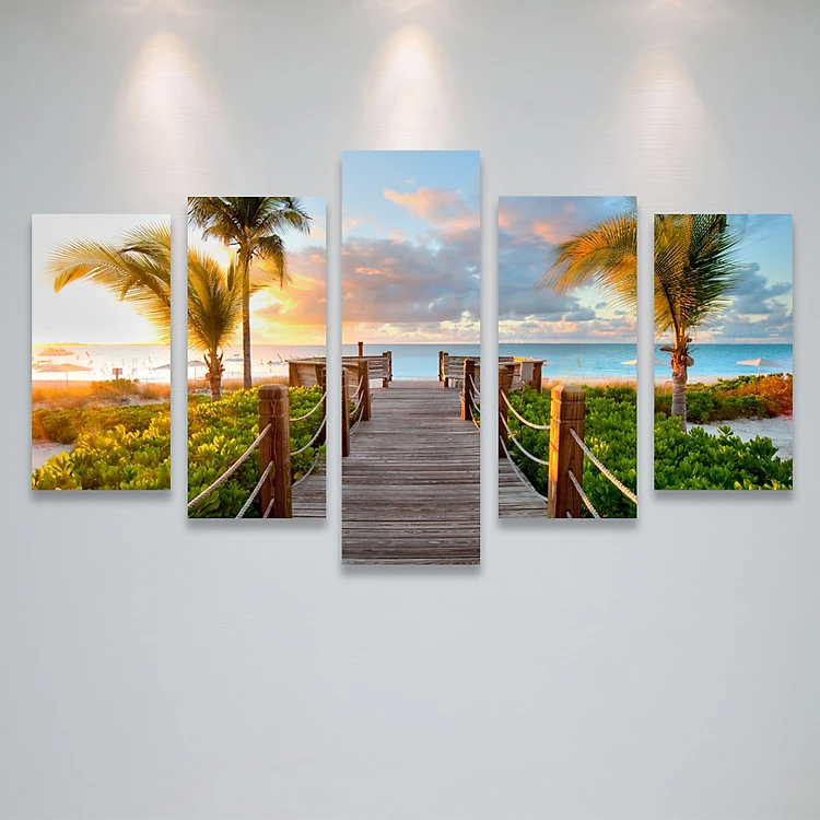 Tranh Ép Ván Gỗ, Tranh Treo Tường Laminate Treo Phòng Khách Chủ Đề Cây Cầu Và Biển, Tranh ghép 5 tấm - PGLMN6