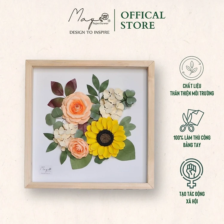Tranh Hoa Giấy Handmade Trang Trí - Bình Minh MAYPAPERFLOWER Khung Gỗ Size 33x33cm