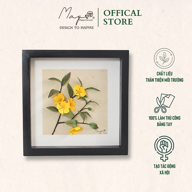 Tranh Hoa Giấy Handmade Trang Trí - Hoa Mai Kết Hợp Giấy Dó MAYPAPERFLOWER Khung Tranh Gỗ Size 25x25cm