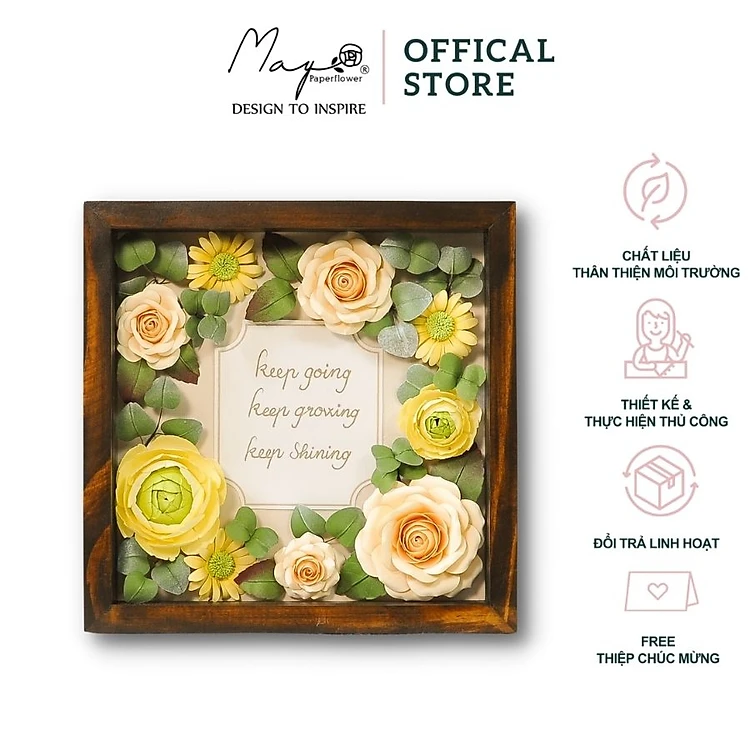 Sản phẩm được làm thủ công hoàn toàn, 100% công đoạn được chế tác và hoàn thiện tỉ mỉ từ bàn tay của các cô gái nhà Maypaperflower. Khung tranh được làm từ gỗ tự nhiên, kết hợp với kính bảo vệ hoa không dính bụi và tránh ẩm mốc. Tranh hoa giấy có kích thước nhỏ gọn dễ dàng mang đi xa. Sản phẩm có hộp lịch sự, được đóng gói cẩn thận phù hợp để làm quà tặng.