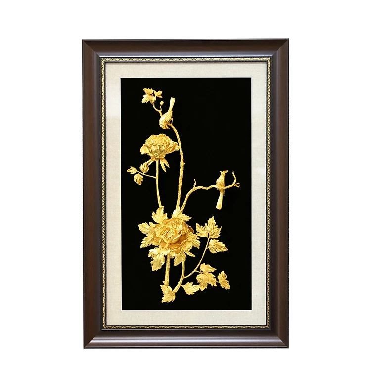 Lấy cảm hứng từ ý nghĩa đó, đội ngũ Golden Gift Việt Nam đã chế tác tranh hoa mẫu đơn mạ vàng, giữ những nét đẹp tinh tế trong từng cành, hoa, lá. Ngoài ra, bức tranh càng thêm sinh động với đôi chim đang hướng về nhau, vừa có ý nghĩa tình cảm thuỷ chung, bền chặt, vừa mang ý nghĩa thịnh vượng, phát tài.