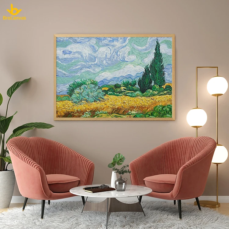 Tranh in canvas trang trí treo tường - Cánh đồng lúa mì xanh " Van Gogh "