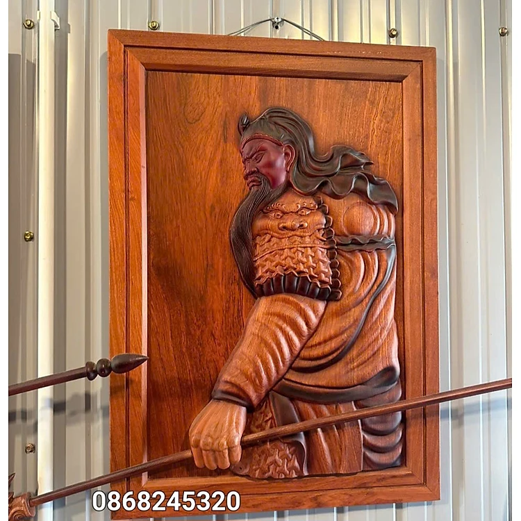 Tranh khắc quan công bằng gỗ hương đá sơn pu giả cổ kt 48×68×6cm