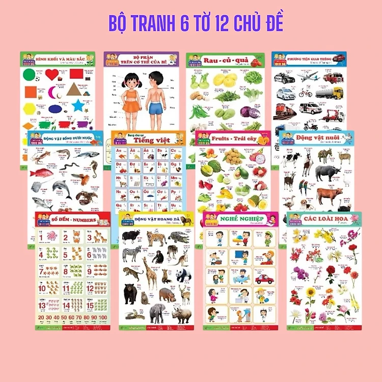 Tranh lò xo- Bộ Tranh Treo Tường 6 Tờ 12 Chủ Đề dành cho bé (Song ngữ Việt Anh)