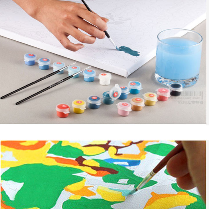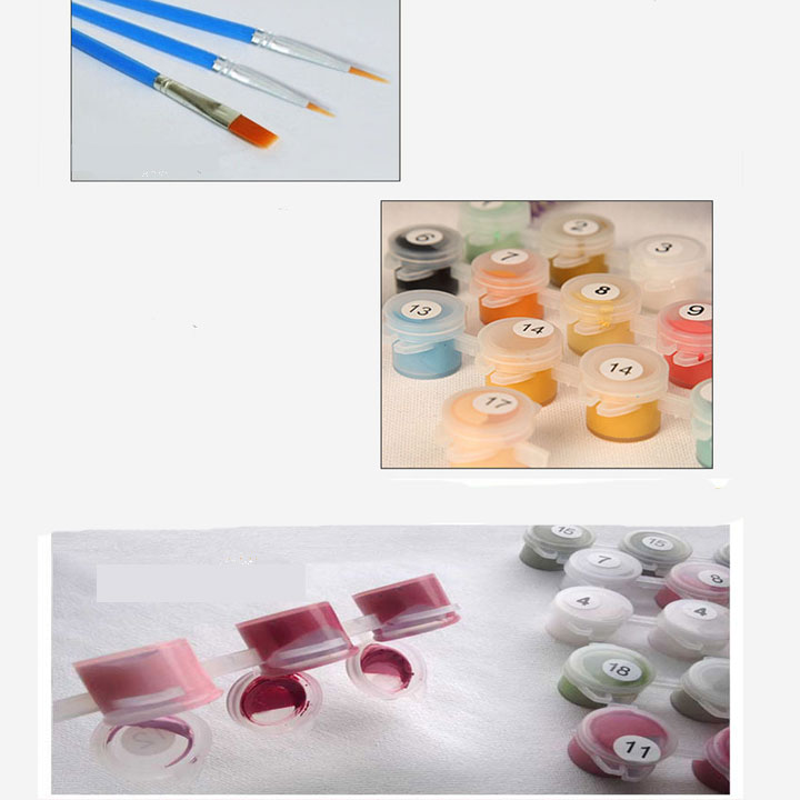 Bộ sản phẩm phẩm: tranh vải canvas + khung gỗ + bộ màu sơn dầu + hộp đựng