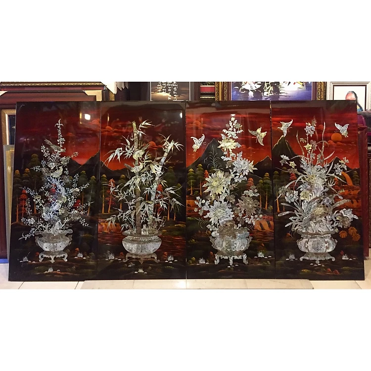 Tranh sơn mài khảm trai Mai Lan Cúc Trúc ( bộ chậu khảm chìm SM005 )