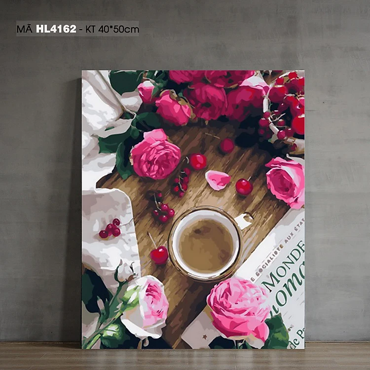 Tranh tô màu theo số tách cà phê bên hoa hồng HL4162