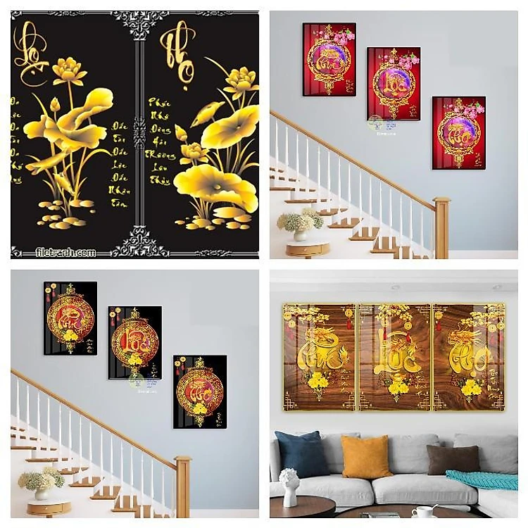 Tranh tráng gương Phúc Lộc Thọ tranh tráng gương phòng ngủ, tranh pha lê treo phòng khách combo 3 bức
