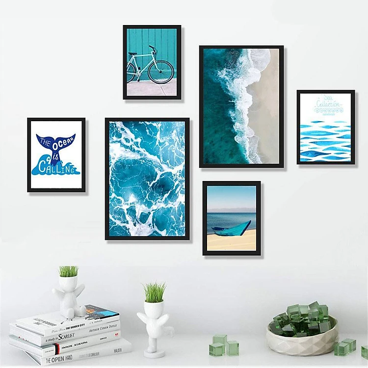 Tranh treo tường 6 bức về biển cả , kèm khung màu đen tươi sáng, hiện đại , Tặng kèm khung và đinh ba chân treo tranh chuyên dụng PVP-TP1621