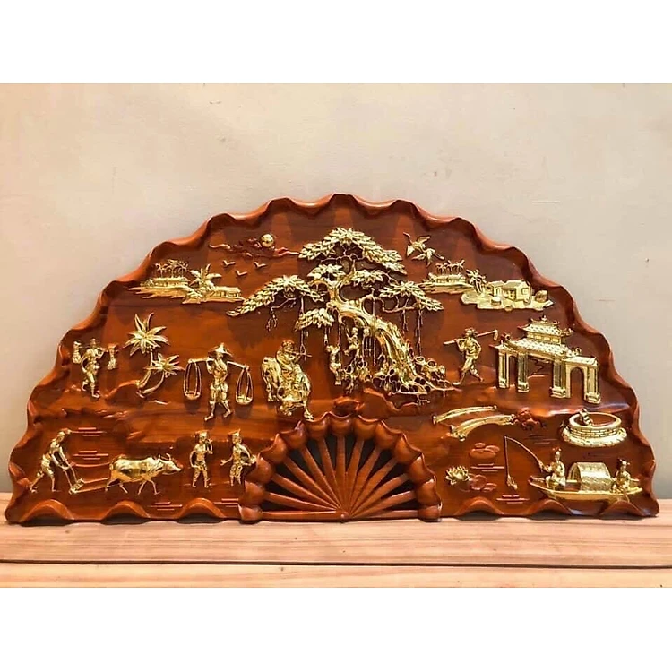 Tranh treo tường cánh quạt trạm khắc đồng quê thanh bình bằng gỗ hương đỏ kt 120×60×4cm