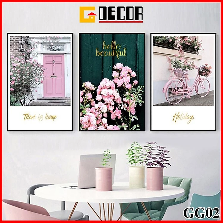 Tranh treo tường canvas khung gỗ 3 bức phong cách hiện đại Bắc Âu tranh hoa hồng trang trí phòng khách phòng ngủ spa 02