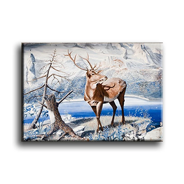 - Bức tranh vẽ hình ảnh một chú hươu đứng ngơ ngác trên ngọn núi tuyết; từng chi tiết nhỏ đều thể hiện sự tỉ mỉ và tâm huyết của người họa sĩ. Bố cục đẹp mắt với màu sắc tươi sáng, bức tranh không chỉ chân thực, sống động như thật mà còn đầy tính nghệ thuật.