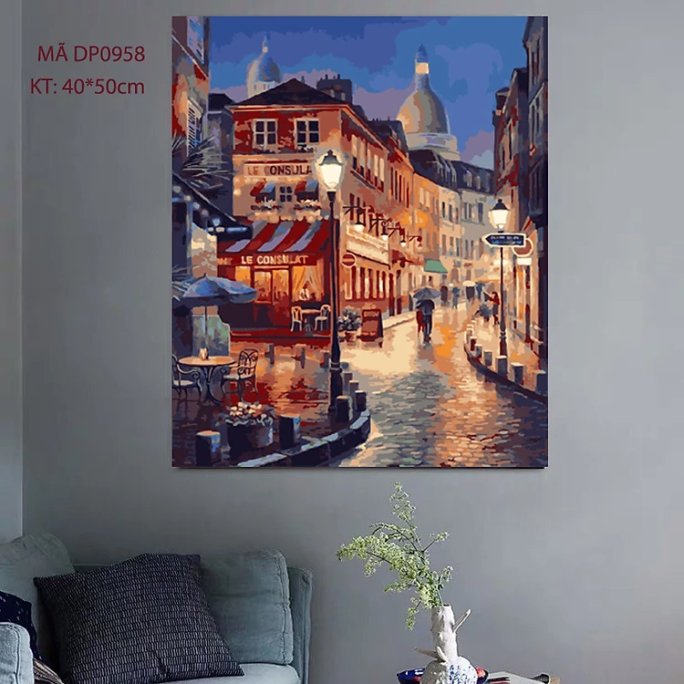 Tranh tự vẽ tự tô màu theo số sơn dầu số hóa cảnh đêm đường phố phố cổ Châu Âu DP0958