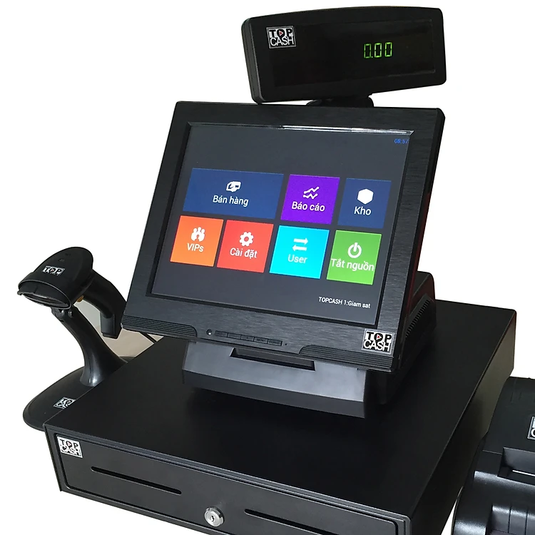 Trọn bộ máy tính tiền cảm ứng 12 in TOPCASH POS QT-66 với phần mềm bán hàng vĩnh viễn kèm máy in hóa đơn kèm máy quét mã vạch và két đựng tiền với màn hình khách xuay đa hướng - Hàng chính hãng
