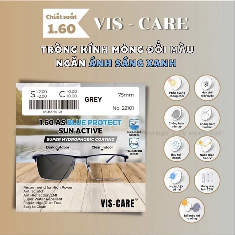 Tròng viscare mỏng 1.60 cận/viễn/loạn đổi màu chống ánh sáng xanh chính hãng mắt kính OURESS