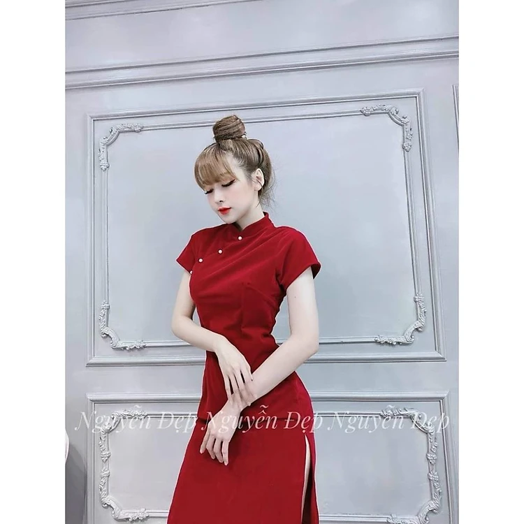 TTO Áo dài cách tân trung hoa nữ màu đỏ kiểu sườn xám cổ tàu đầm dáng ôm tết du xuân chụp hình sống ảo