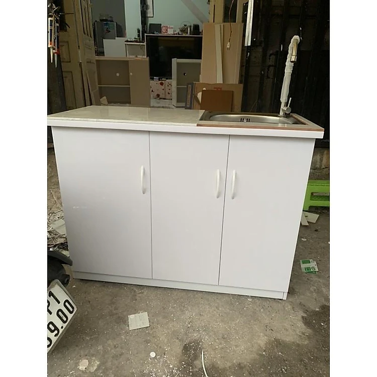 Tủ bếp nhựa đài loan màu trắng có bồn rửa và mặt bếp dán gạch