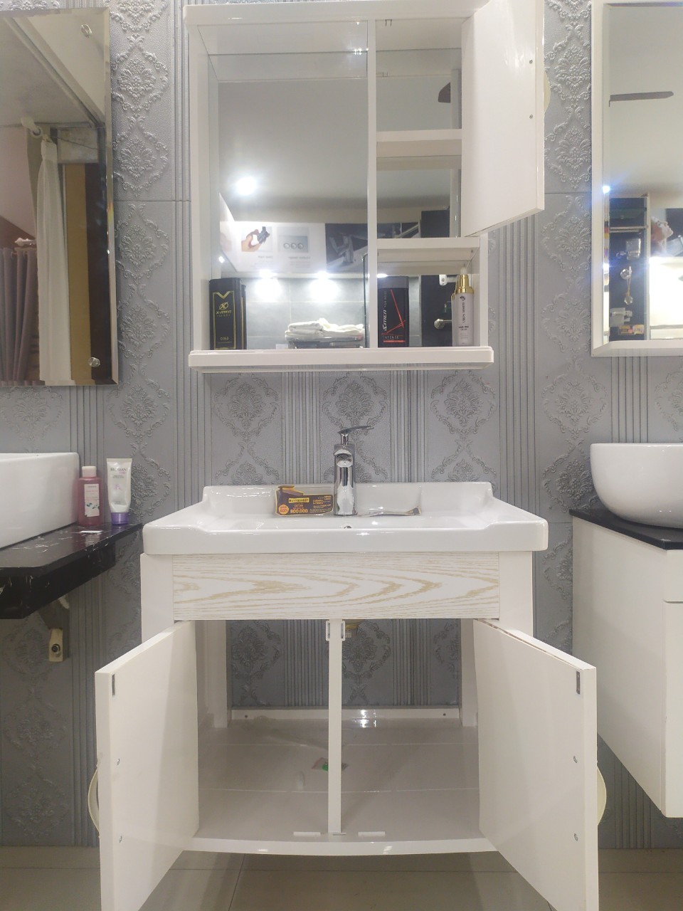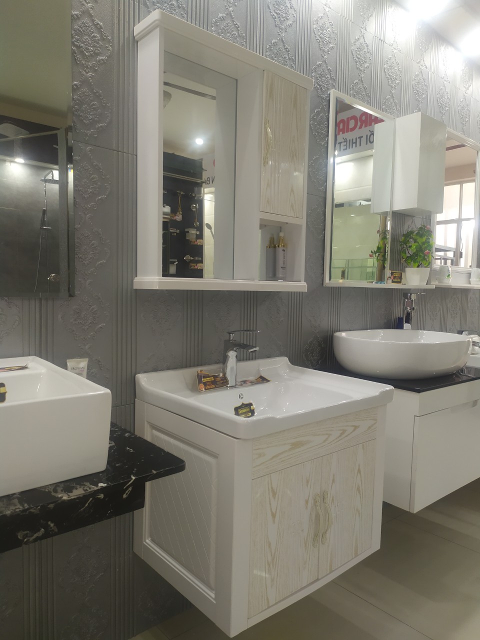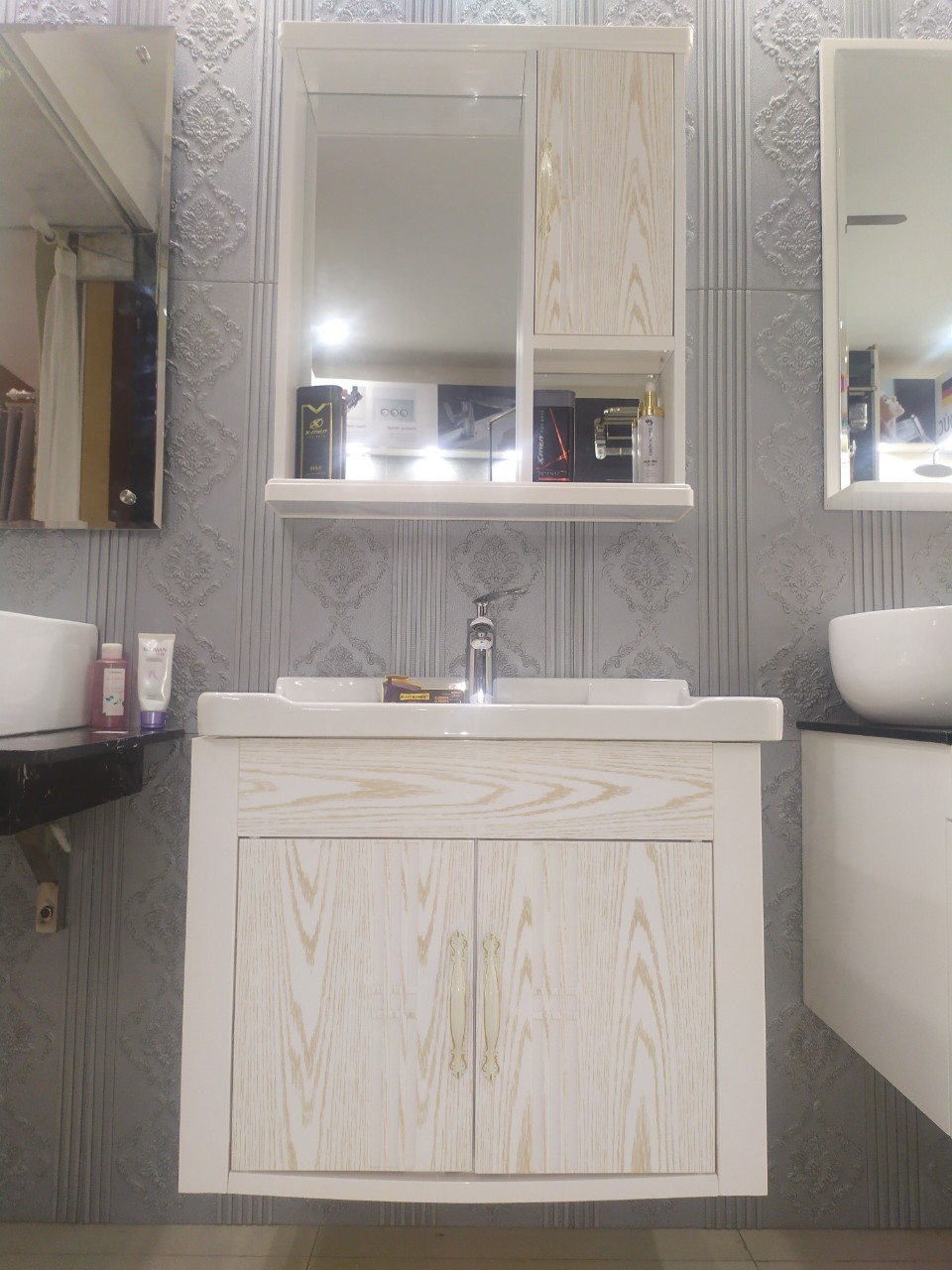 – Bộ sản phẩm gồm chậu lavabo, tủ chậu, tủ gương (Không kèm theo vòi chậu, xi phông hay ống xả).