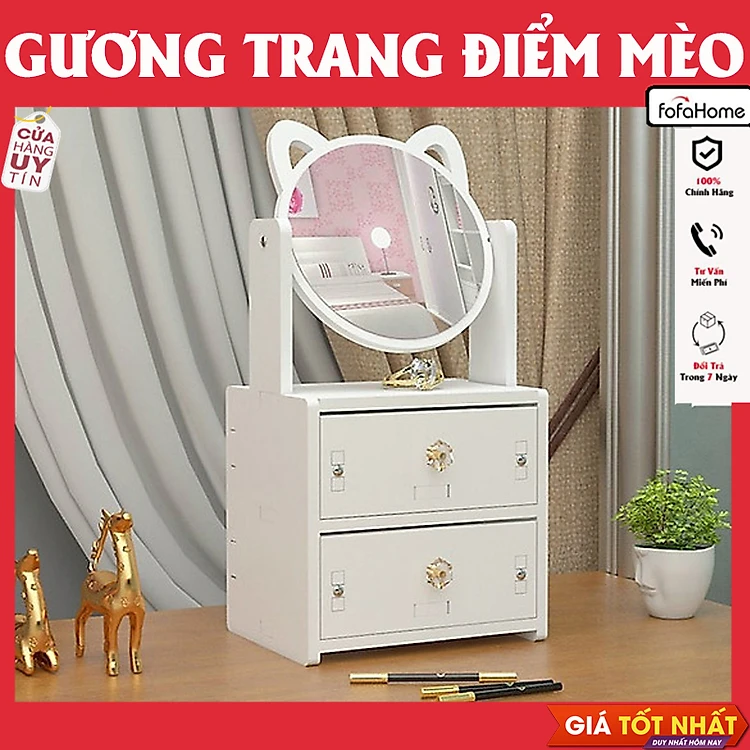 Gương Trang Điểm Để Bàn Tủ Để Đồ Trang Điểm Có Ngăn Kéo Và Gương Xoay 360, Kệ Để Đồ Đa Năng Thiết Kế Sang Trọng Màu Trắng