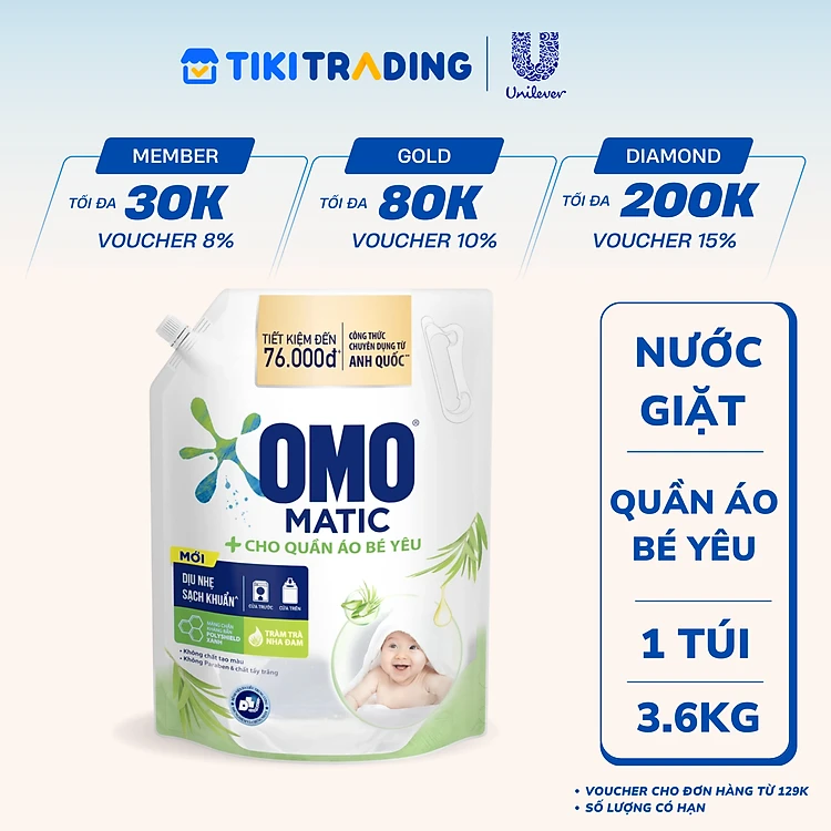 Túi Nước Giặt Omo Matic Cho Quần Áo Bé Yêu Chiết Xuất Tràm Trà Và Nha Đam Dịu Nhẹ, Sạch Khuẩn 3.6kg