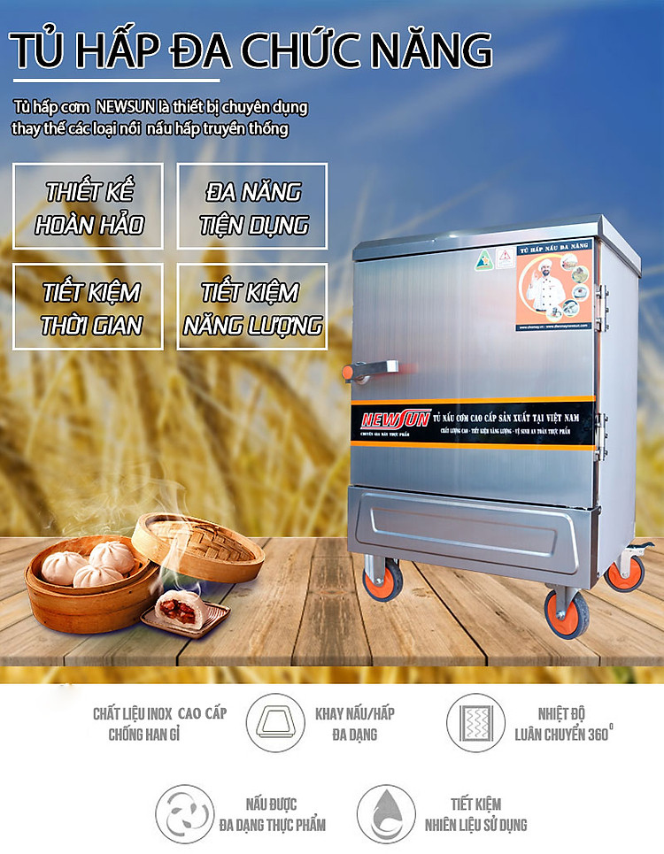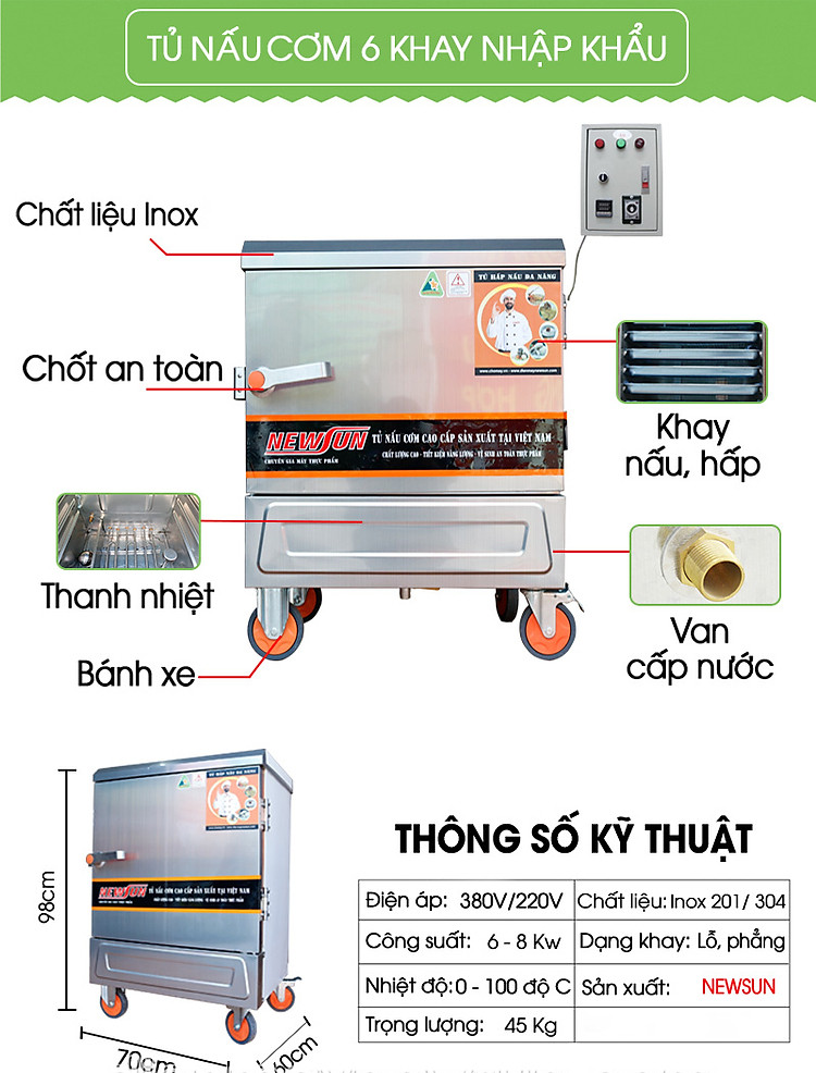 Tủ hấp cơm 6 khay dùng điện nhập khẩu chính hãng được phân phối với giá ưu đãi chỉ có tại NEWSUN. Tủ hấp cơm hoạt động trên nguyên lý dùng hơi nóng và áp suất giúp cơm được hấp chín nhanh, giữ được hương vị, màu sắc và dinh dưỡng nhất.