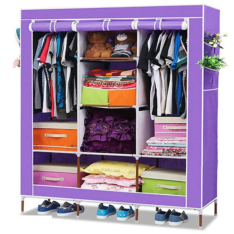 Tủ quần áo-Tủ quần áo khung sắt-Tủ quần áo vải khung sắt 3 buồng(Giao màu ngẫu nhiên)