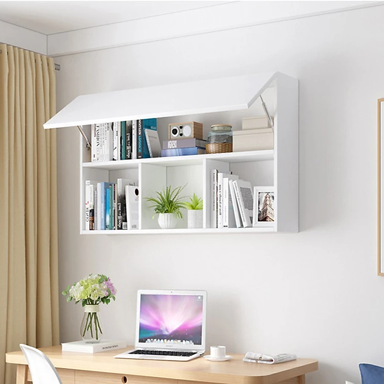 Kệ sách được treo lên tường giúp tiết kiệm diện tích căn phòng (với kết cấu âm kệ giấu chân chắc chắn và thẩm mỹ). Thiết kế nửa hở nửa kín với hệ cách sử dụng 2 tay nâng dễ dàng sử dụng.