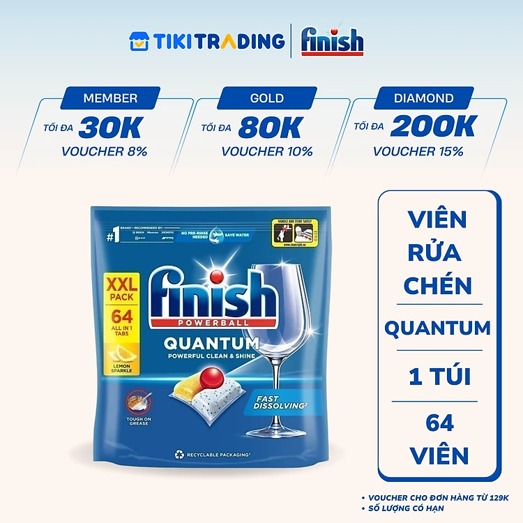 Túi 64 Viên Rửa Chén Bát Finish Powerball Quantum 12x sức mạnh, túi lớn siêu tiết kiệm