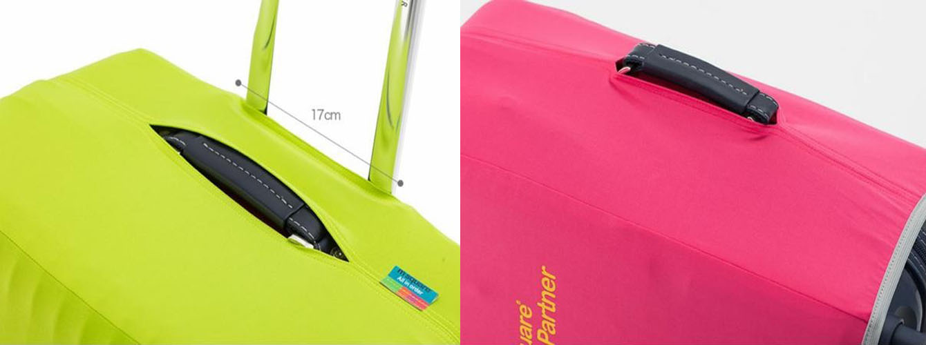 - Phần sườn túi bọc vali được thiết kế hở giúp bạn dễ dàng sử dụng quai xách vali khi cần thiết, thanh kéo và tay xách phía trên cũng được để hở
