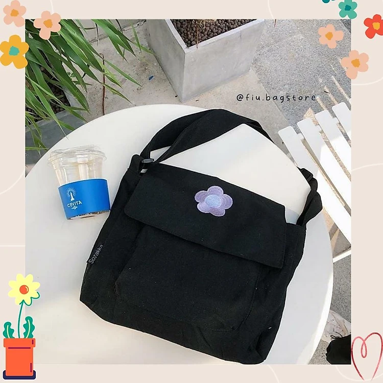 Túi Đeo Chéo Canvas Thêu Hoa Có Vải Lót Trong